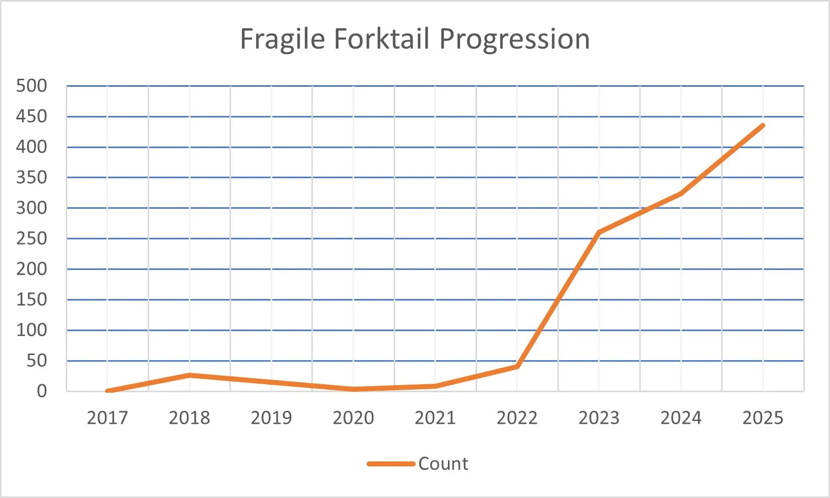 I. posita, con esta leyenda: Cambios en el número de Ischnura posita registradas en el Arboreto Morton de Lisle, Illinois, con la incorporación del estanque Fischer en 2023.