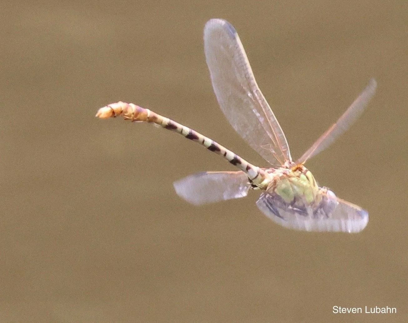 Había Stylurus spiniceps, pero no S. plagiatus ni S.tylurus notatus. Los añadiría más adelante en la temporada. Por ahora, me dirigí a la orilla opuesta. Caminé con cuidado por la hierba enmarañada, que una semana antes estaba bajo el agua. Y entonces... ...divisé una misteriosa libélula de cola anillada en la hierba. Conseguí tomar dos fotos antes de que la libélula se alejara volando sobre la maleza.